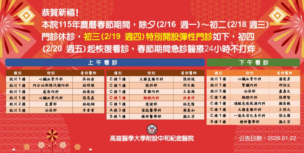高雄 春節期間醫療服務不中斷 高醫加開彈性門診與傳染病特別門診 2026-02-02 春節期間,高醫加開彈性門診與傳染病特別門診。 (記者王正平翻攝) 記者王正平/高雄報導 農曆春節假期將至,高醫在春節期間急診、血液透析及住院照常服務;門診及檢查自除夕(2/16)至初二(2/18)暫停,初三(2/19)開設彈性門診,已開放網路與語音掛號;初四(2/20)恢復門診。 另為兼顧農曆春節期間傳染病病人就醫需求及急重症醫療品質,於初一(2/17)至初三(2/19)開設傳染病特別門診,如有需求的民眾可於前一個日曆天午夜12點上網掛號,亦提醒民眾進入院區建議配戴口罩。 Previous articleHesap Olmadan Pinup’da Oynayabilir miyim?Next article中山大學新型質子膜突破瓶頸 助攻氫能淨零碳排 航運船期表 萬達國際物流股份有限公司2026.02.02 2026-02-02 0 萬達國際物流股份有限公司2026.02.02 沛華實業股份有限公司2026.02.02 2026-02-02 0 沛華實業股份有限公司2026.02.02 航運新聞 航運新聞 航港局強化春節及和平連續假期海運安全展開船舶場站抽... 2026-02-02 0 記者李... 航運新聞 昇恆昌董總深化公益行動帶頭全員志工寒冬送暖 2026-02-02 0 記者李... 近期新聞 高雄 柯志恩到傳統市場送春聯 祝福大家在新年馬上有錢 高雄 鳳山光之季 春節推出15場秀 台中 回應近期民調 楊瓊瓔:尊重參考 台中 佈局台中觀光城市品牌成果亮眼 從海線到國際、打造世...