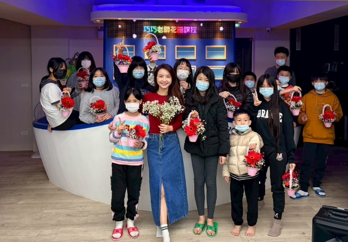 自立青年吳巧瀅帶領基隆家扶汐止服務處二十名兒少一起製作新年花圈。身為花藝師的她教導孩子挑選花材、搭配色彩與造型;兒少專注完成屬於自己的新年花圈。