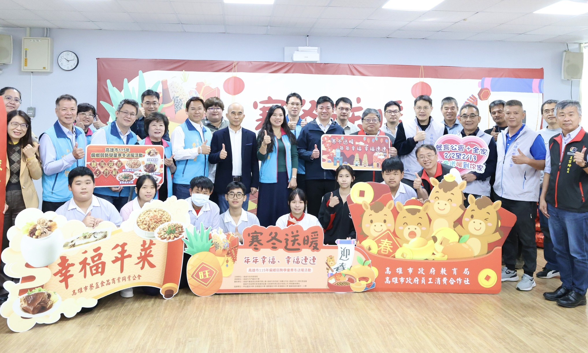農曆春節將至,為讓偏鄉弱勢學童在寒冬中也能感受團圓溫暖,高雄市教育局四日於內門國中舉辦「一一五年弱勢學童寒冬送暖幸福團圓活動」,攜手餐盒公會、家長會長協會及多個民間團體,捐贈二四五份年菜、四0五份福袋與紅包,將滿滿祝福送到孩子與家庭手中,陪伴學童暖心迎接新春。