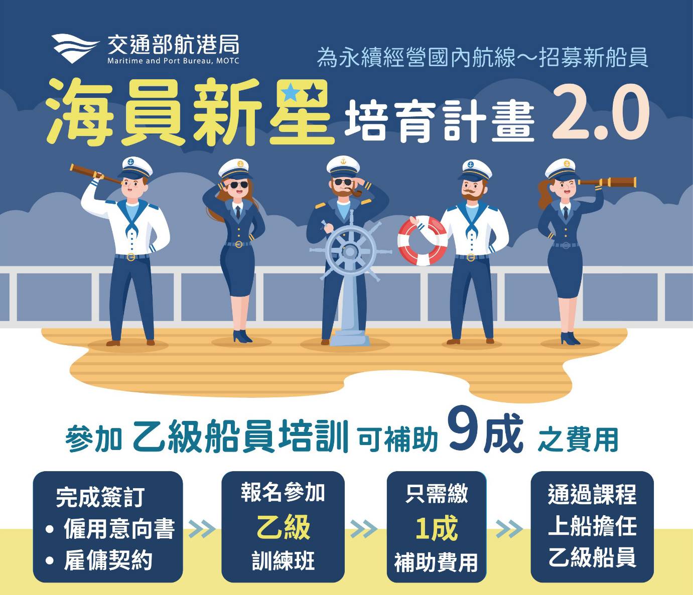 有志投入海運產業的青年與轉職民眾,可把握「海員新星培育計畫2.0」補助資源,踴躍報名乙級船員養成訓練班。目前國內由財團法人中華航業人員訓練中心及臺北海洋科技大學訓練機構開設相關課程,相關資訊亦可上網查詢。中華航業人員訓練中心:02-2492-2118  #23 江組長,臺北海洋科技大學 海事人員訓練部:02-2810-9999#2621吳小姐