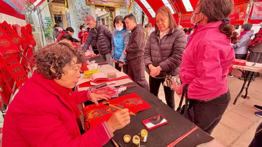 農曆春節即將到來,朝元宮管理委員會主任委員尤碧鈴邀請名書法家現場揮毫,寫出吉利及討喜的文句,或是由鄉親自行挑選的佳句,吸引大批民眾爭睹及索取春聯,現場充滿新春過年氣氛。
