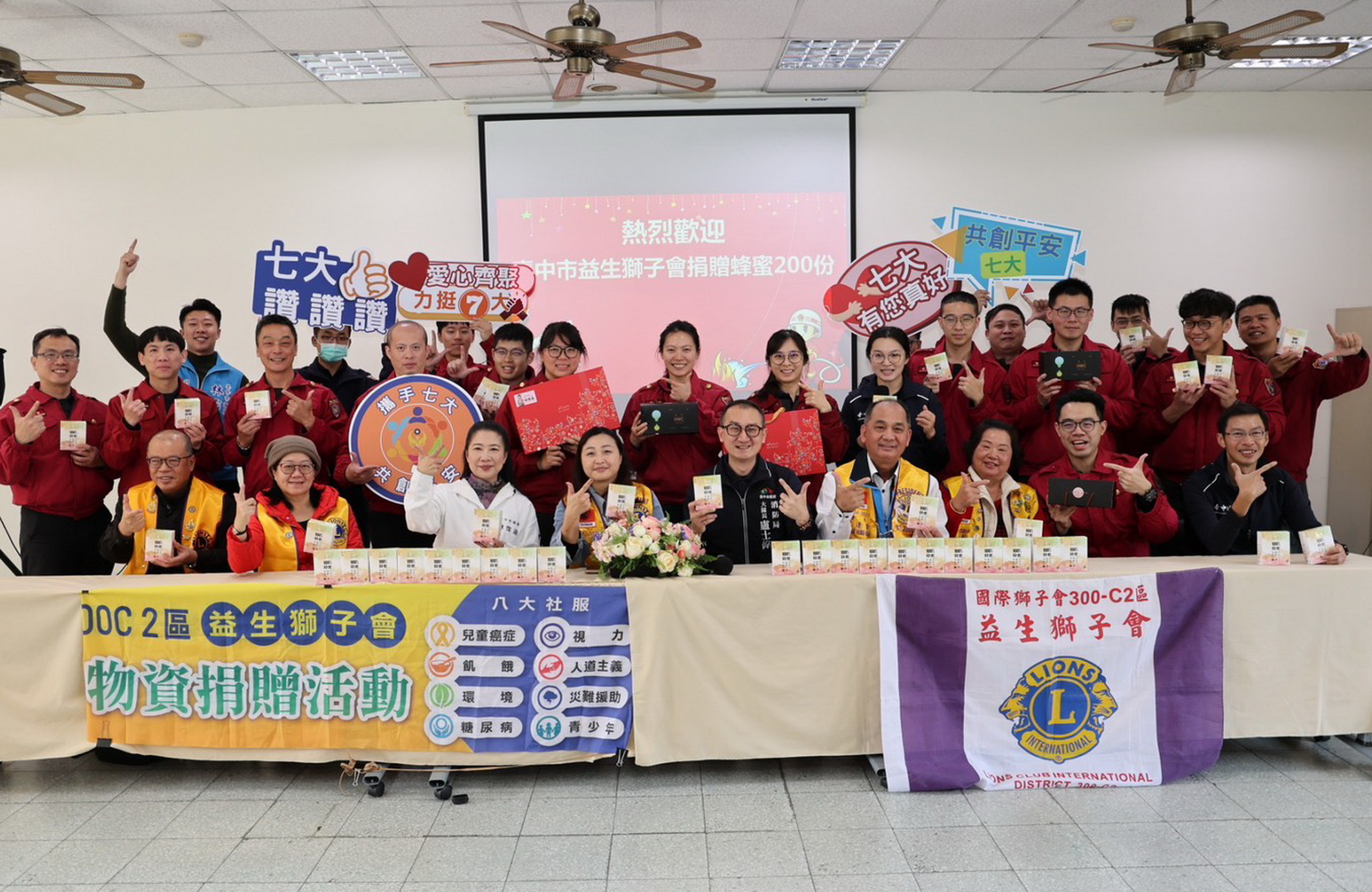 農曆佳節將至,台中市益生獅子會會長楊顏菱九日上午致贈甜蜜蜂蜜禮盒予台中市消防局第七大隊暨所屬分隊同仁,慰勞辛勤的消防人員,並感謝其全年無休投入救援與防災工作,守護市民安全。
