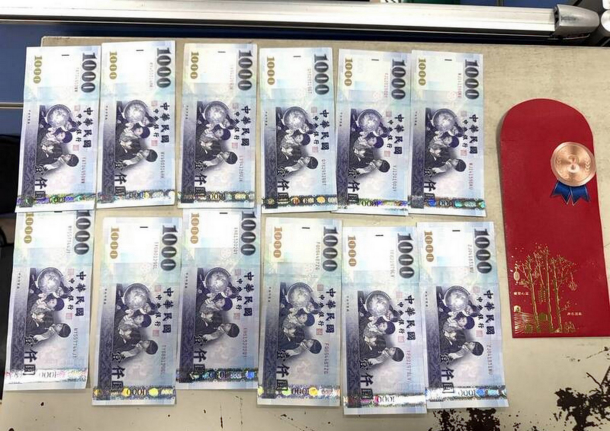 台中市第四警分局九日表示,呂男於二日參加尾牙,在近百名員工中幸運抽中「參獎」、現金一萬二千元紅包袋,呂男晚宴後步出會場,未料,紅包竟從口袋滑落到大墩南路邊,數十分鐘後,路人發現地上印有「參獎」字樣,立刻將紅包送到大墩派出所。