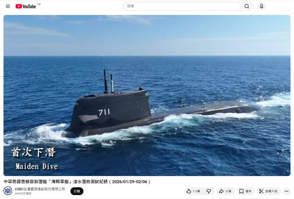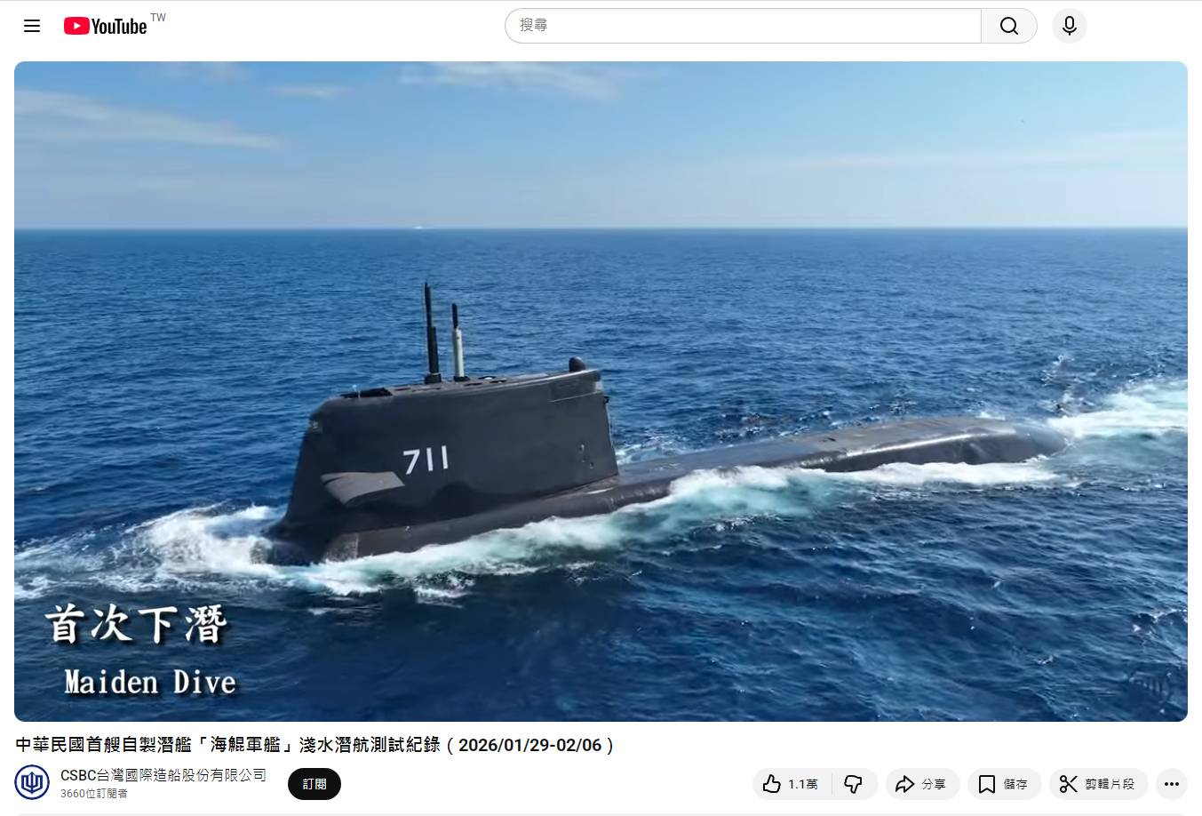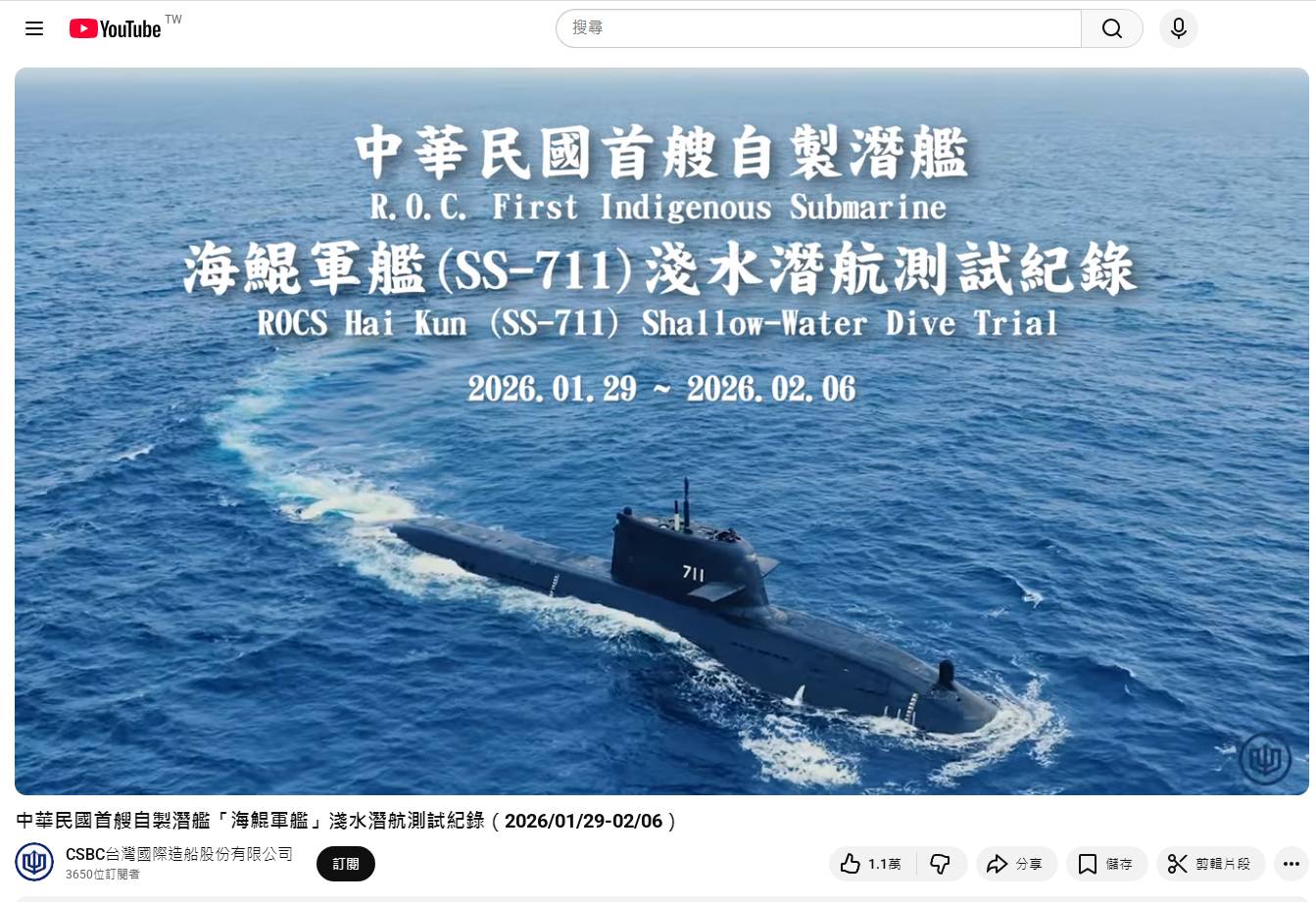 台灣國際造船公司為爭取國人支持潛艦國造政策,除推出系列潛艦知識科普,也將上週四次首艘自製潛艦「海鯤軍艦」在YOUTUBE發表紀錄影片分享。(附圖為影片截圖)