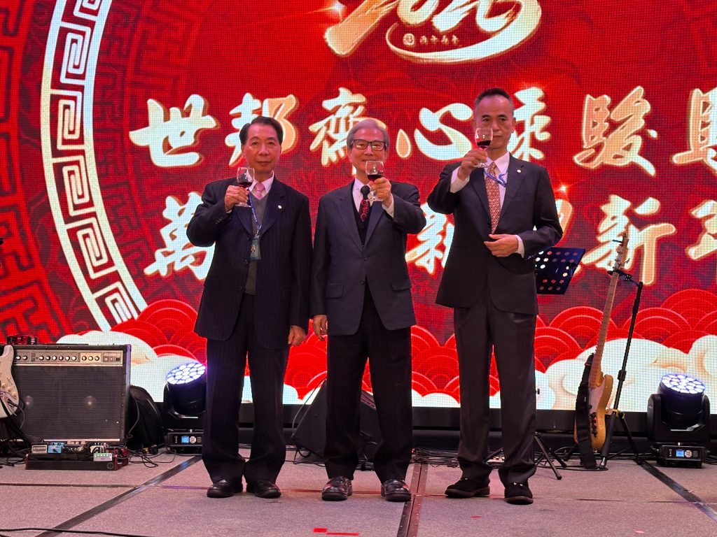 世邦集團董事長李健發(中)偕同兩位副董事長阮文欽(左)、闕壯興(右)舉杯致賀。(記者陳瓊如攝)