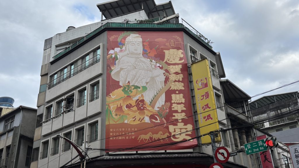 基隆慶安宮在全市高掛全新賀年看板,邀請在地設計工作室「港齋」創辦人、設計師兼畫家李沁設計,以「慶賀新歲‧馬年平安」為主題,以溫潤而喜氣的朱紅色系為主軸,向市民拜年。