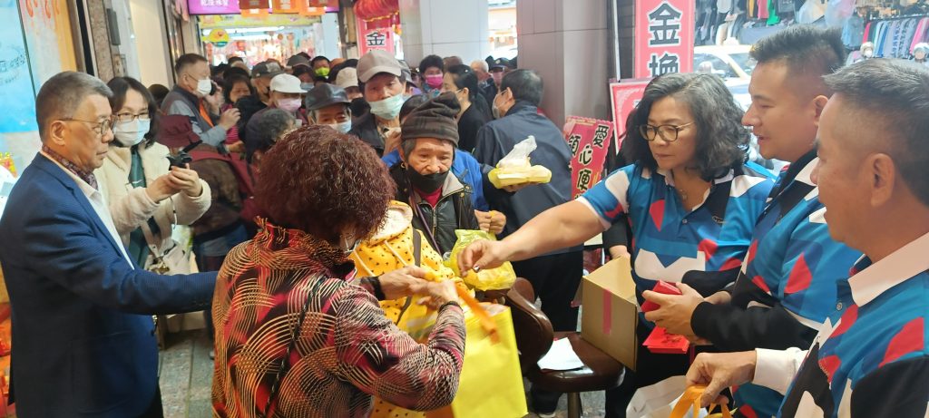 基隆市區仁愛市場,連續十一年在乾隆珠寶金店發放的「愛心便當」,十二日在農曆春節前加碼發放紅包、小福袋及T恤等物資,由全聯會大台北廣告高爾夫球隊會長廖麗嬌(王妃)、副會長廖聰明及總顧問林慶同等人,在現場加發送紅包與小福袋等物資數百份,發送給社會上弱勢族群及老人家,不到十分鐘就發送一空。