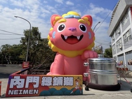 高雄市政府民政局表示,內門山城由大型氣偶IP「總鋪獅」現身南海紫竹寺,融合宋江陣的英勇精神,與總舖師的熱情款待形象設計,當鼓聲響起、香氣瀰漫,象徵角色甦醒,展現內門特有的豪氣與人情味。