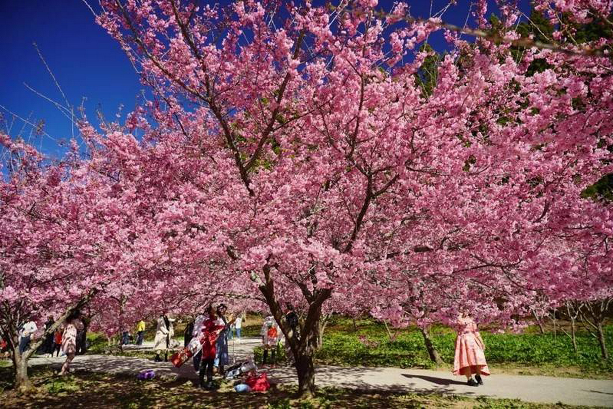 福壽山農場的櫻花品種多,千櫻園內的千株櫻花目前綻放吸引遊客賞花,農場表示,過去常有櫻花品種標示錯誤情況,去年請專門研究櫻花的老師為農場的櫻花正名,千櫻園裡種植數量最多的是椿寒櫻。