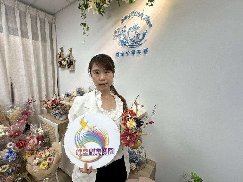貝拉分享,走過家庭劇變後,她獨自扶養兩名年幼的孩子,為了給自己一個可以活下去的力量,她重新拾起少女時期對花藝的熱愛,並結合自身在人資與情緒陪伴領域超過十年的經驗,進修取得情緒芳香師與花藝專業證照,並開始構思如何把專業轉化為支持他人的力量。在中彰投分署協助下,她運用「微型創業鳳凰貸款」資金,成立貝拉公主花藝店,期望結合花藝設計、一對一芳療諮詢、企業課程或花藝接案,打造不同於傳統花店的「療癒型花藝空間」,讓顧客不只買花,更能感受被理解與被接住的溫度。