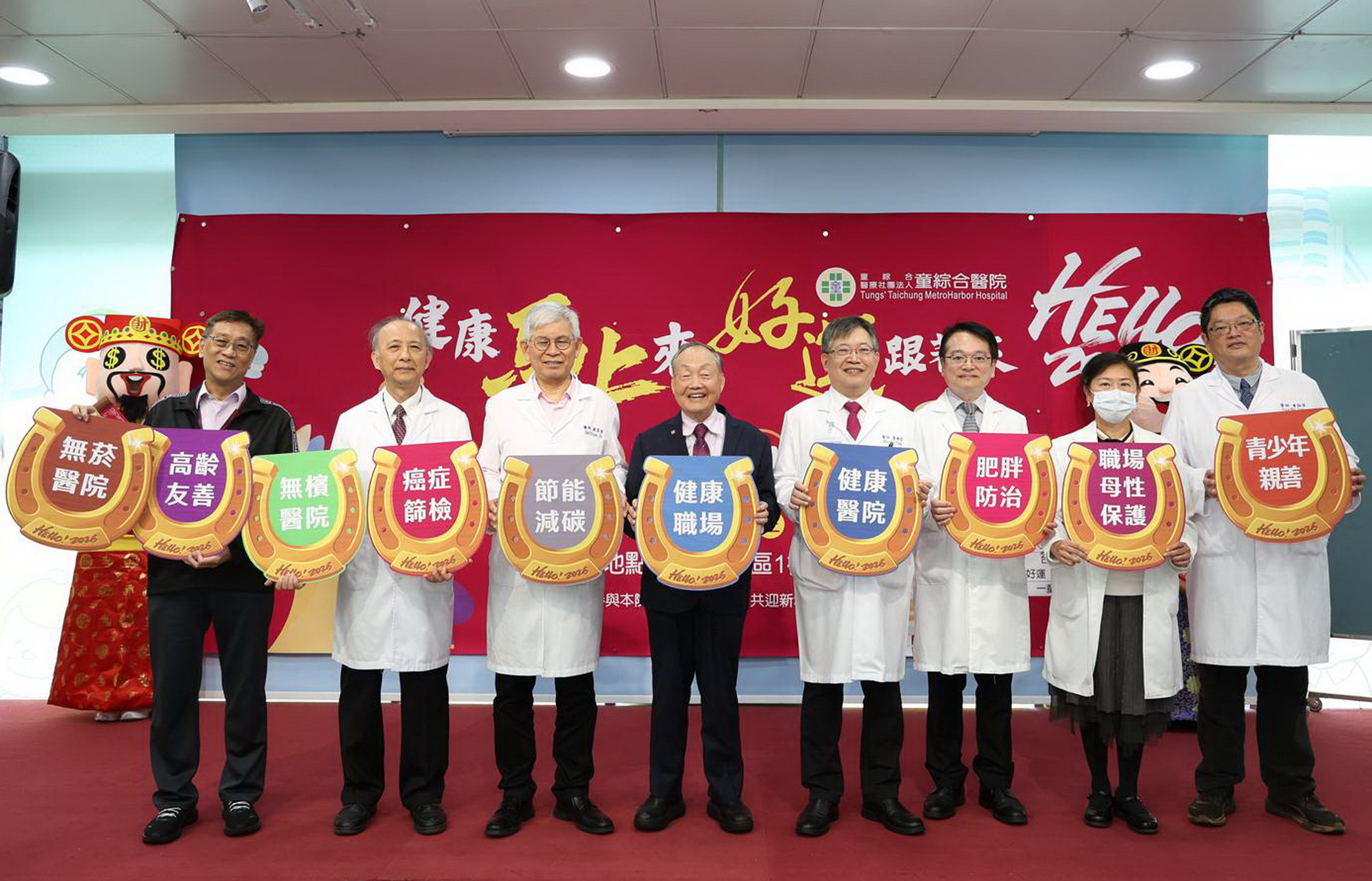 童綜合醫院全面貫徹執行健康醫院與健康職場的宗旨,因此積極推動無菸檳醫院、高齡友善、癌症篩檢、節能減碳、肥胖防治、職場母性保護與青少年親善,今年響應馬年用馬蹄鐵為概念,緊密結合串聯各項健康理念標語,也讓民眾都能更清楚如何促進健康。