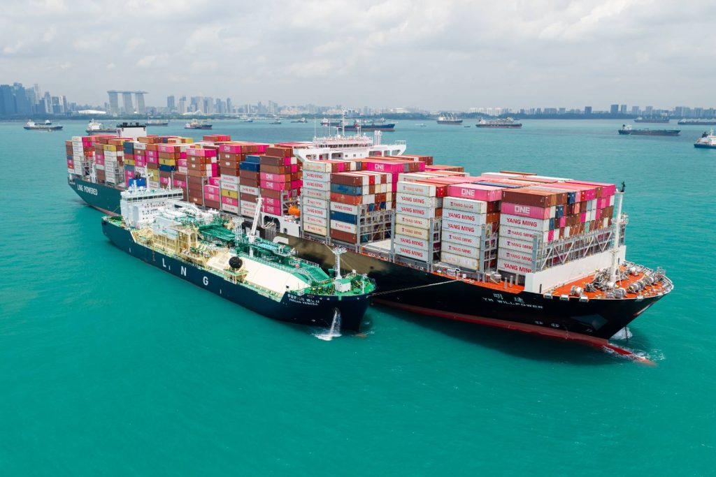 附圖為陽明海運「連明輪」於新加坡完成首次LNG加注作業。(陽明海運提供)