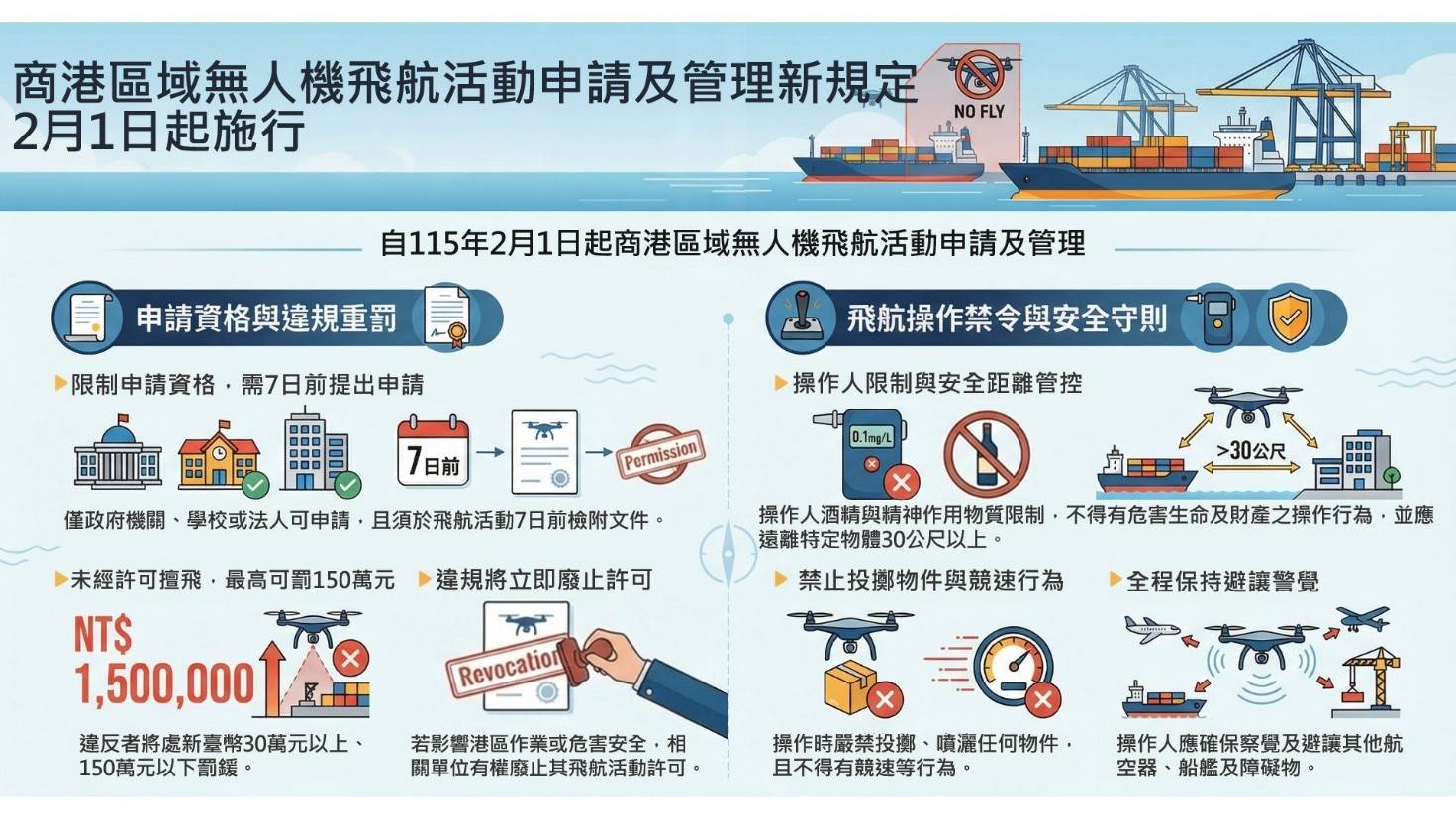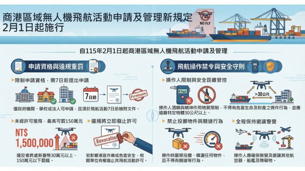航港局表示,為強化國家關鍵基礎設施安全並維護商港區域作業秩序,行政院核定商港法第36條之1及第65條之1自115年2月1日起施行,未經許可擅自在商港區域內從事遙控無人機飛航活動,或雖經許可但違反相關規定者,將依商港法處新臺幣30萬元以上150萬元以下罰鍰,情節重大者並得沒入遙控無人機。