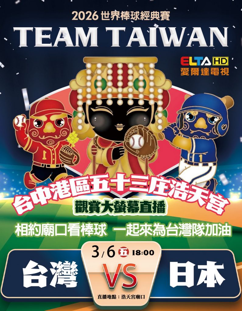 眾人期待的二0二六年世界棒球經典賽,台灣隊迎戰日本隊即將於六日晚間六時開打,為替台灣隊應援打氣,台中港區五十三庄浩天宮特別於廟口廣場架設直播大螢幕,現場同步轉播賽事,邀請鄉親朋友一同到場為台灣隊加油喝釆。