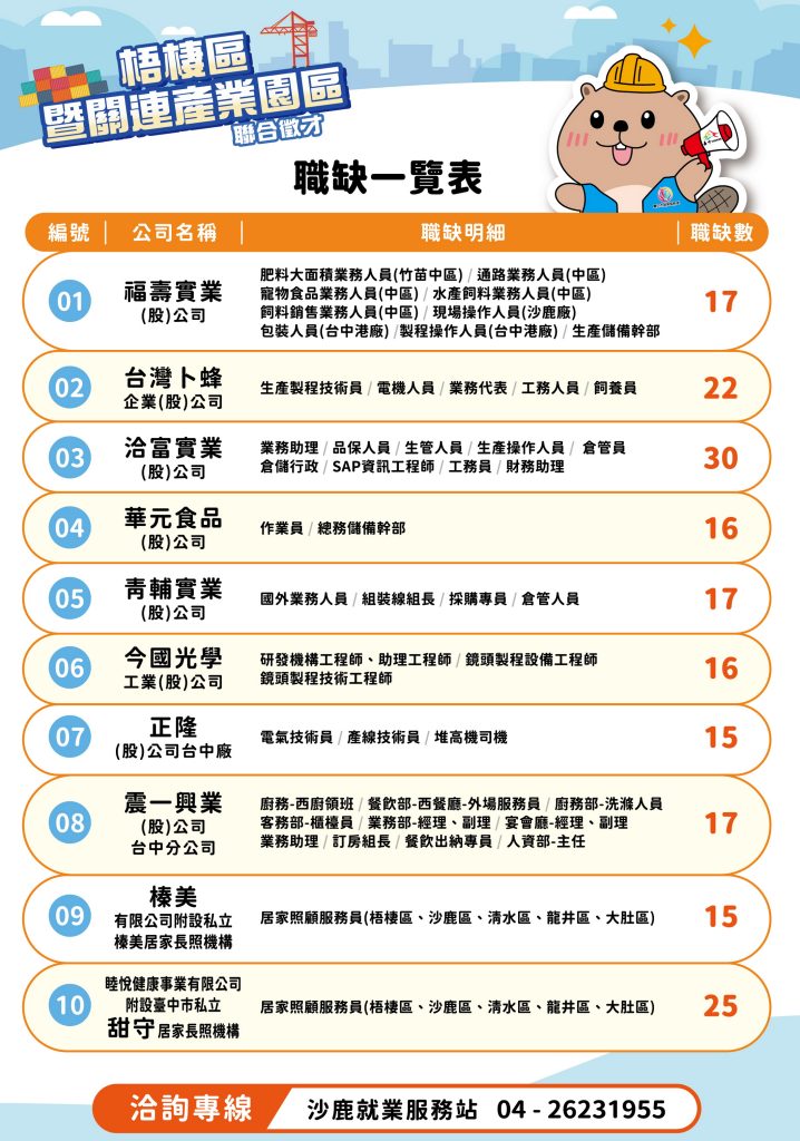 勞工局長林淑媛指出,此次參與廠商,包含福壽實業、台灣卜蜂、洽富實業、華元食品、青輔實業、今國光學、正隆台中廠、震一興業,以及榛美與甜守居家長照機構等,職缺橫跨基層作業到專業技術職務,部分職缺亦提供完善教育訓練與升遷制度,適合青年朋友及正在尋職民眾投入發展,長照相關職缺更呼應高齡化社會趨勢,提供有志投入照顧服務產業者穩定就業選擇。