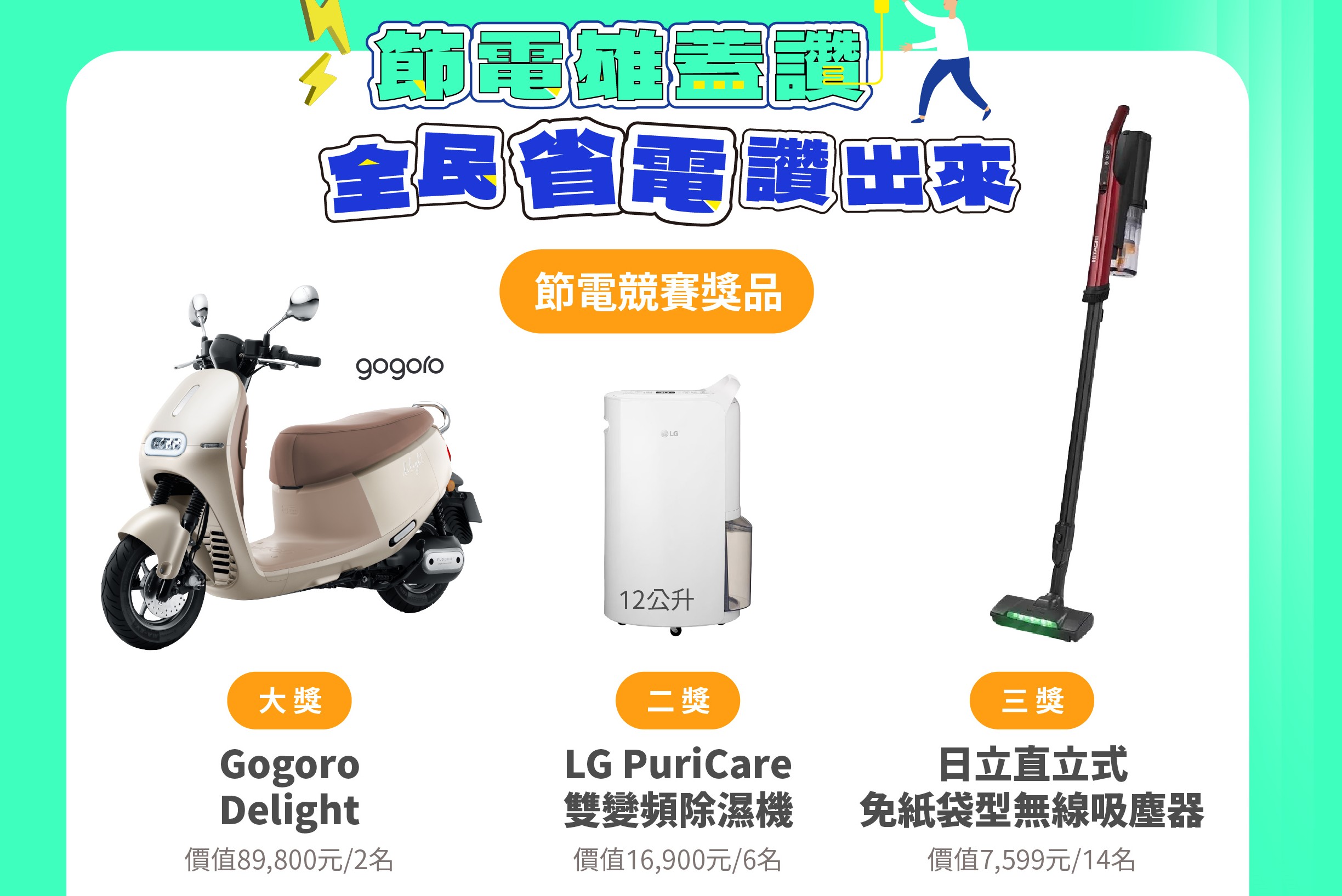 活動設計多項獎勵方案,家戶組及商家組最大獎可獲得價值近九萬元的電動機車(各一名),二獎至四獎(包含一級能效除濕機、手持式吸塵器、節能DC電風扇)共計有四十個獎項,還有八十名五獎的一千五百元禮券,獎項多多,歡迎民眾及商家踴躍參加;另外若符合將老舊「冷氣」或「冰箱」汰換為一級能效者,活動將再抽出八十名汰換家電鼓勵獎。