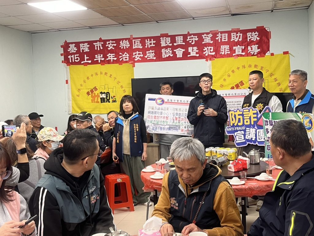 警四分局為強化社區治安及提升民眾防詐意識,結合安樂區壯觀里守望相助隊,舉辦「一一五年上半年治安座談會暨犯罪預防宣導」活動,由安樂派出所所長陳品碩,率同偵查隊及分局業務組人員到場與里民交流,傾聽地方意見並宣導最新犯罪預防觀念。