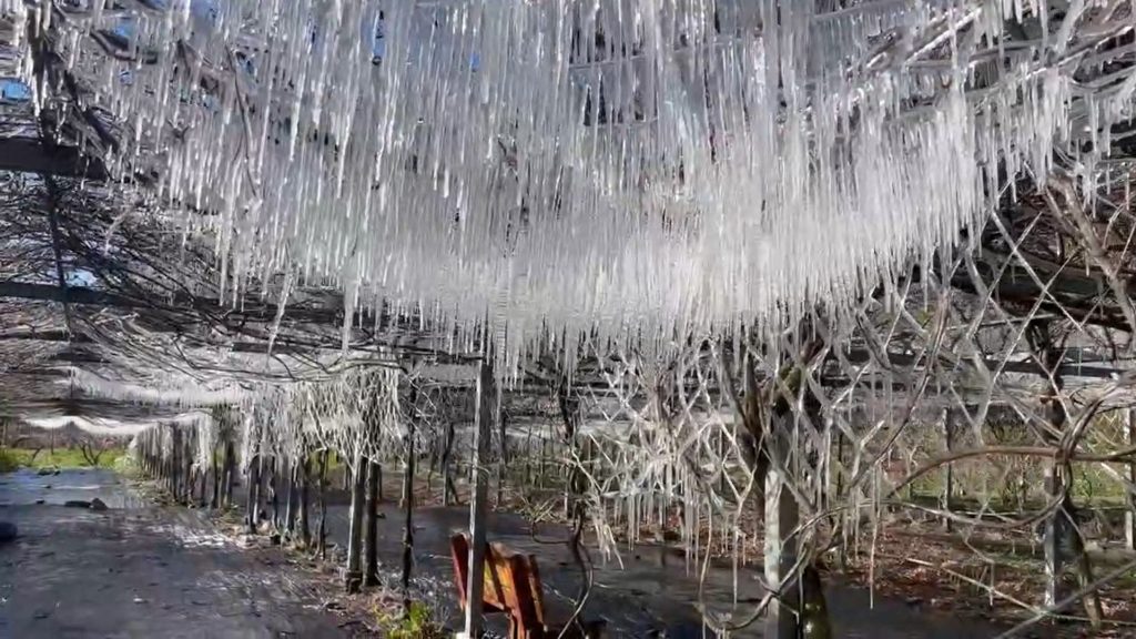 武陵農場表示,高山氣候多變,三月的春天仍偶有嚴寒。預防灌溉系統因低溫結冰造成管線破裂,場方在凌晨氣溫降至零下0點六度時啟動灑水防凍。沒想到,細小的水滴在接觸到藤架與植物的瞬間,極低溫迅速凝結,從藤架上垂下的冰柱如瀑布般傾洩而下,形成了一道巨大的「水晶簾幕」。