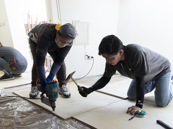 遠雄文教基金會表示,另一頭的幼兒園修繕現場,由於環境潮濕,寢室木地板長年受潮腐壞,地面出現多處坑洞,過去學童午睡時只能打地鋪,還得刻意避開破損處,影響休息品質。志工們先行拆除舊有地板,再依序鋪上防潮布、加鋪夾板、上面料,最終進行牆邊收邊,儘管是在室內施作,但光在拆除舊地板的步驟,就已經讓志工們滿頭大汗。