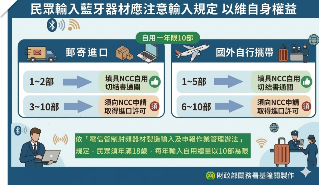 基隆關說明,依據「電信管制射頻器材製造輸入及申報作業管理辦法」第9條第2項及第3項規定,民眾輸入藍牙耳機、無線喇叭等器材設有年齡、總量、免證及許可證申請等限制。年齡及總量管制方面,須滿18歲,每年輸入自用總量以10部為限。免許可證門檻(須簽具自用切結書)方面,郵寄或快遞,每次不得超過2部;旅客隨身攜帶,每次不得超過5部。須申辦許可證方面,若郵寄3至10部,或隨身攜帶6至10部者,應事先向NCC申請取得進口許可證,海關始得憑證核放。
