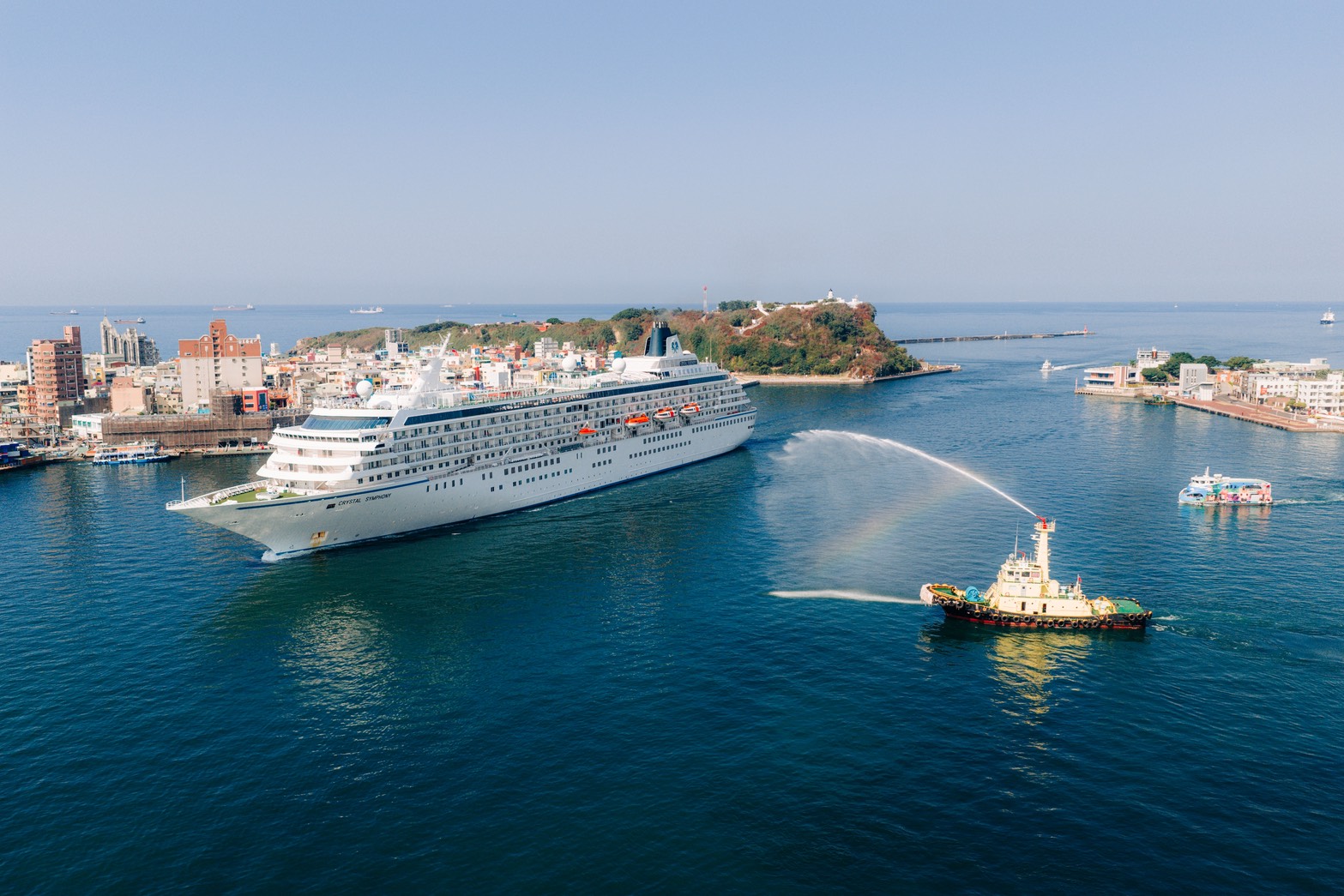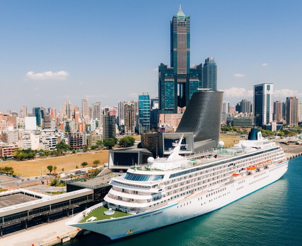高雄港本(3)月郵輪精彩不斷!繼3月8日地中海郵輪「地中海榮耀」(MSC BELLISSIMA)及3月11日銀海郵輪「銀海明月號」(SILVER MOON)相繼首航後,3月18日上午再迎國際郵輪新面孔—水晶郵輪「水晶合韻號」(Crystal Symphony)首度靠泊高雄港,成為今年第5艘首航高雄港的國際郵輪,高雄港務分公司特別以象徵歡迎的噴水儀式隆重迎接郵輪進港,並致贈船長首航紀念牌,表達誠摯歡迎之意。此次亦為水晶郵輪首次將旗下郵輪帶至高雄港,未來也期待能將高雄港納入航線規劃,持續拓展合作契機。