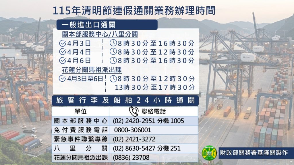 基隆關表示,為維持進出口通關順暢,115年清明節連假期間(4月3日至6日),將派員辦理通關業務,免徵收特別驗貨費及特別監視費。