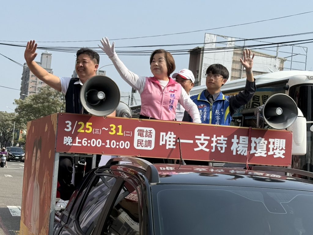 楊瓊瓔站上宣傳車向民眾揮手拜票,許多開車、騎車民眾與沿線店家看到車隊經過,紛紛揮手打招呼,有人拿出手機拍照,路口支持者高喊加油、凍蒜聲此起彼落,氣氛熱絡。