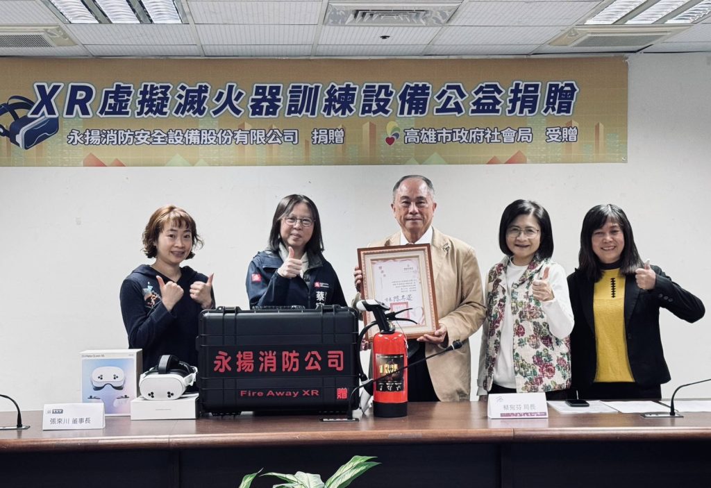 高雄市政府積極提升社會福利機構的防災韌性,首創運用「XR虛擬實境技術」,以非常擬真的工具,帶給機構一線人員防災知能;社會局感謝永揚消防設備公司公益捐贈「XR虛擬滅火器」設備,這項科技應用打破空間限制,讓原本靜態的防災教育變為極具臨場感的實作訓練,以期面對突發火警時,增加工作人員第一時間防備技能,提升機構防火安全。