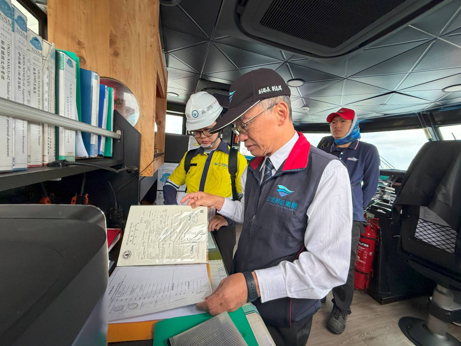 清明節連續假期將至,海運疏運即將啟動,交通部航港局完成船舶及場站安全檢查,並重申民眾注意船班動態並備妥身分證件、遵守行動電源正確攜帶使用方式。(附圖為航港局兩位副局長督導船舶及場站安全檢查情形,航港局提供)