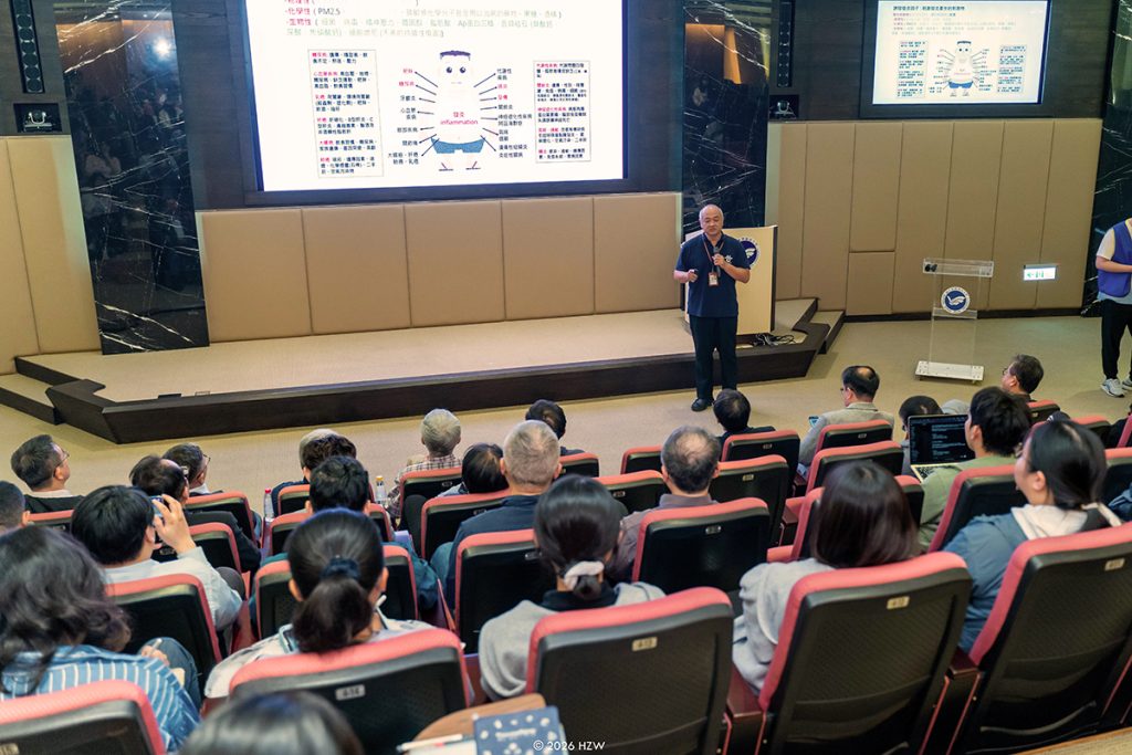王育民於演講中深入淺出地解說發炎機制,他指出,發炎並非只是身體短暫的防禦反應,而是與癌症、器官纖維化、神經退化及多種慢性疾病密切相關的重要生物機制,研究團隊多年來即從「失控的發炎反應」切入,嘗試找出能牽動多種疾病的關鍵節點,他說明團隊如何透過臨床資料、生物資訊、細胞實驗與動物模式,逐步建立「關鍵蛋白—疾病進程—治療策略」之間的因果鏈結,讓抽象的分子訊號,慢慢長成可被理解、可被驗證、也可能被治療的故事。