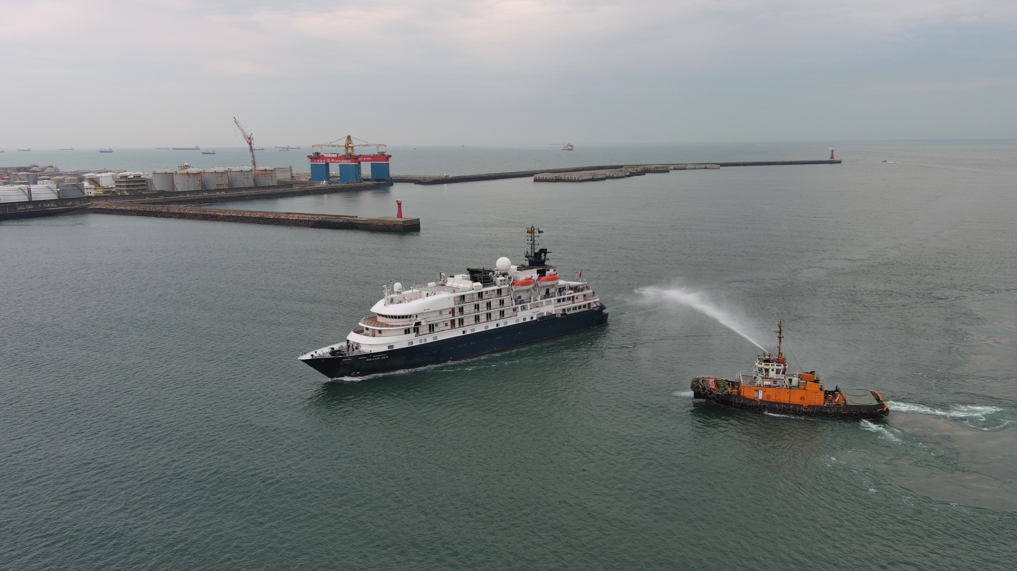 以噴水禮迎接島嶼天空蒞臨臺中港。(臺中港務分公司提供)