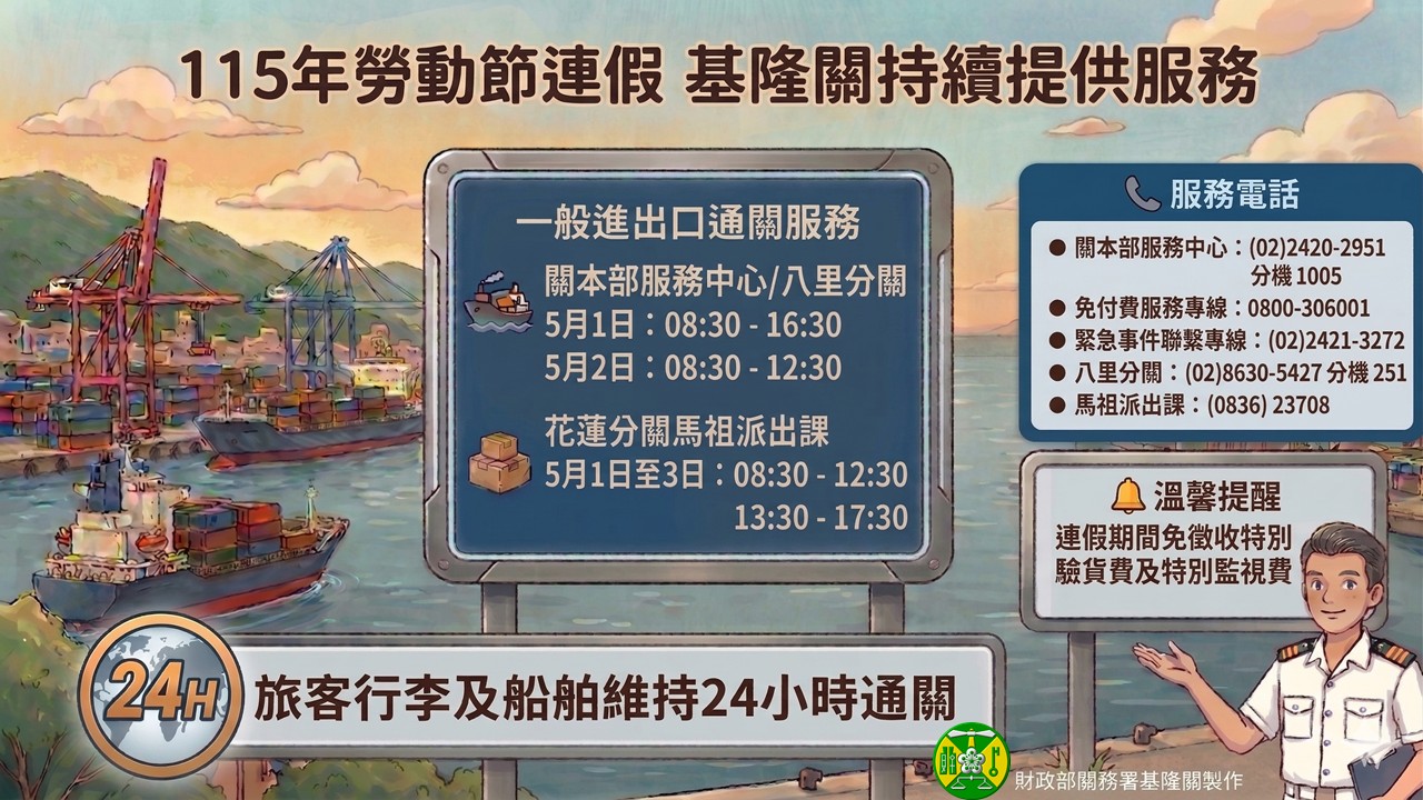 基隆關表示,為維持進出口通關順暢,115年勞動節連假期間(5月1日至3日),將派員辦理通關業務,免徵收特別驗貨費及特別監視費。