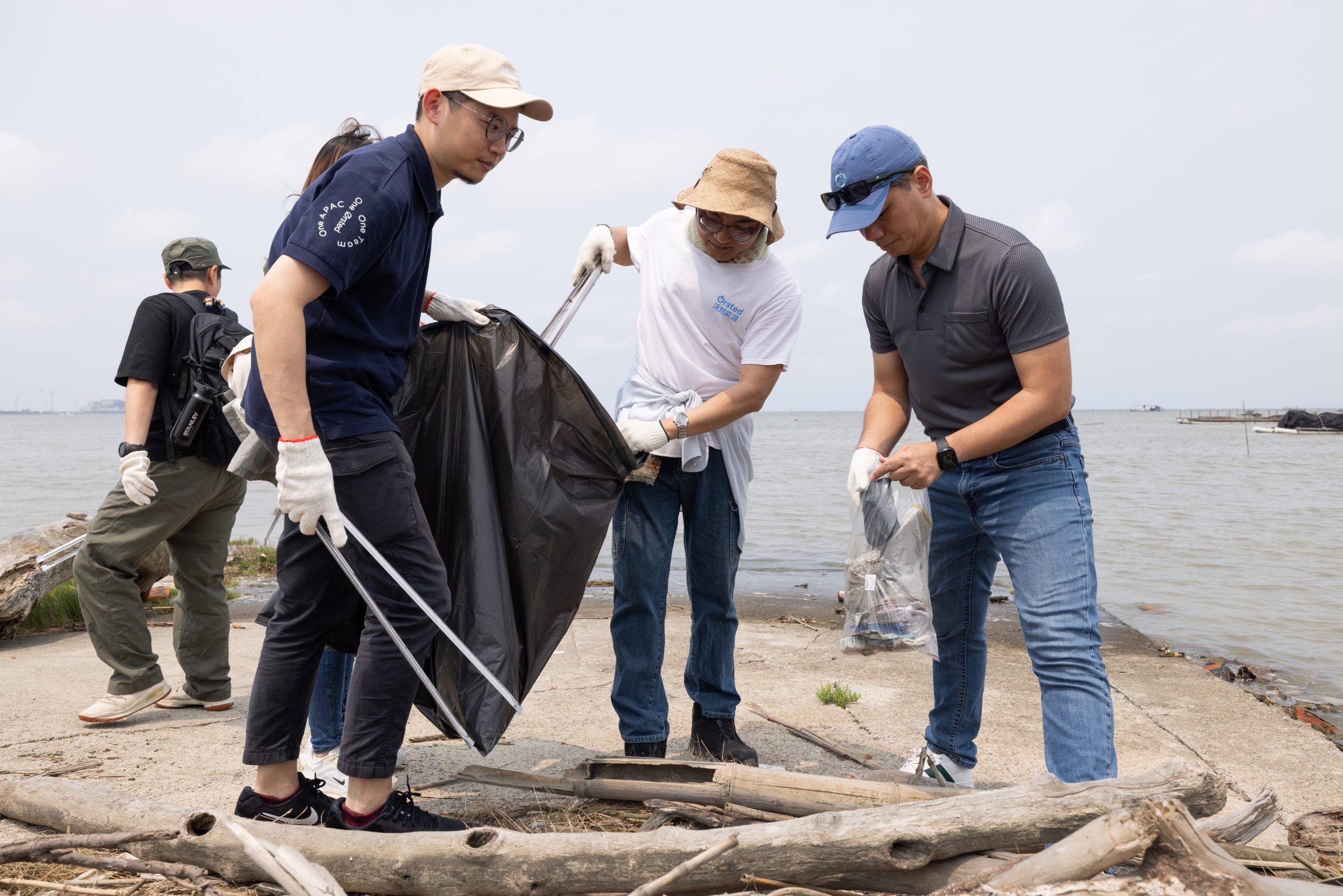 沃旭能源員工齊心合力維護大肚溪潮間帶生態環境。(記者陳金龍攝)