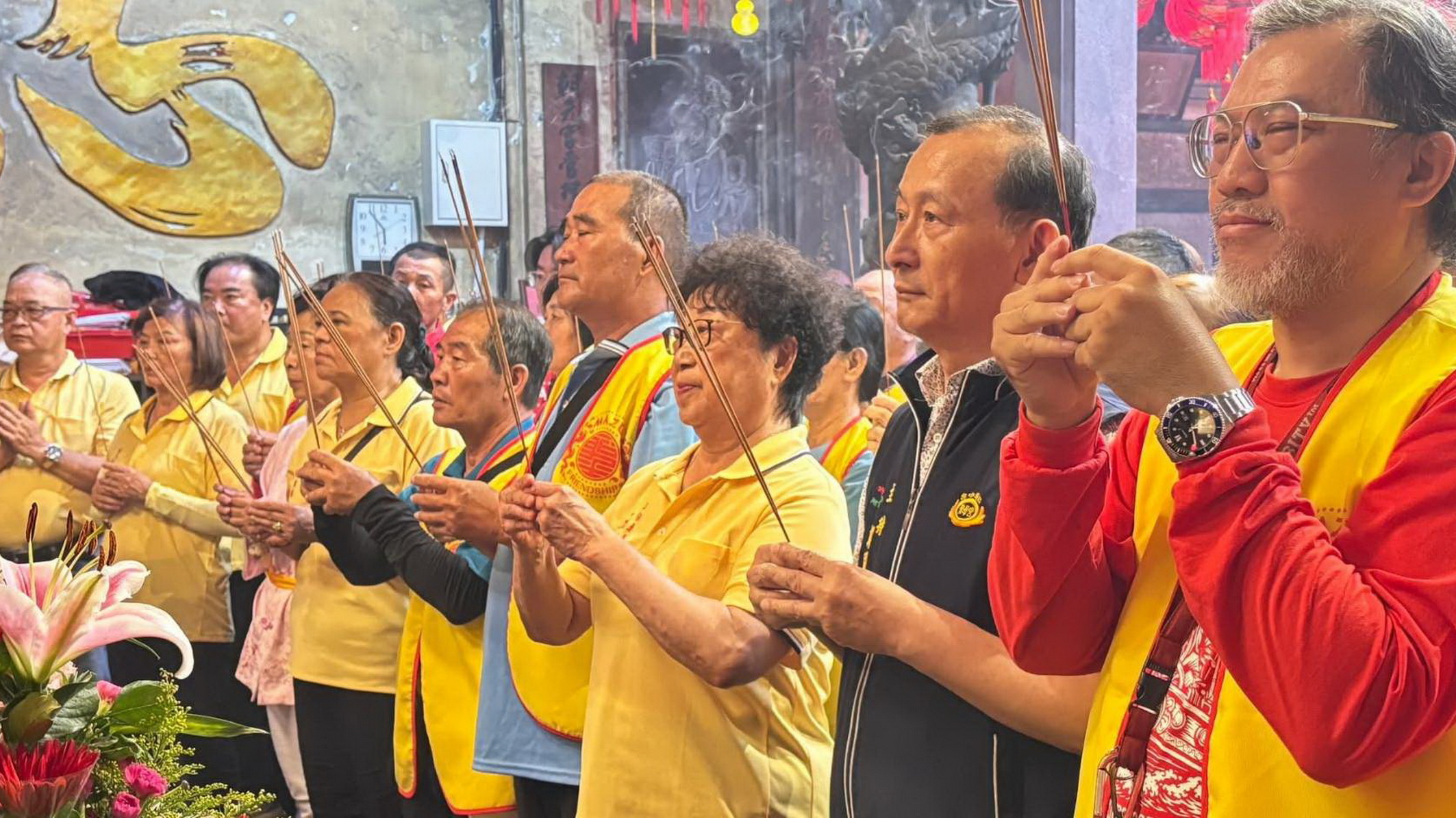 媽祖聯合環台海巡遶境,二十日晚駐駕台中梧棲朝元宮,朝元宮管理委員會主任委員尤碧鈴等廟方人員,恭敬持香參拜,迎接感恩聖母佑萬民。(記者陳金龍攝)