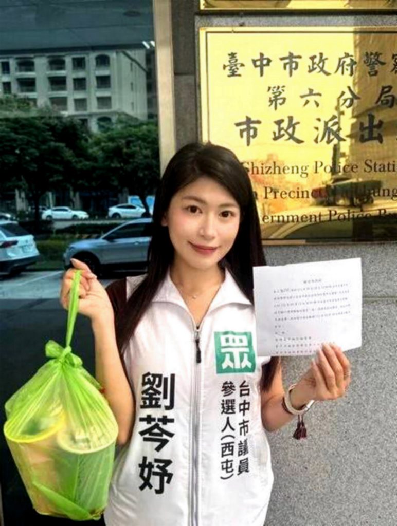 台中市民眾黨西屯區市議員參選人劉芩妤昨日前往第六分局撤告,還特地準備飲料慰勞基層員警。(記者陳金龍攝)