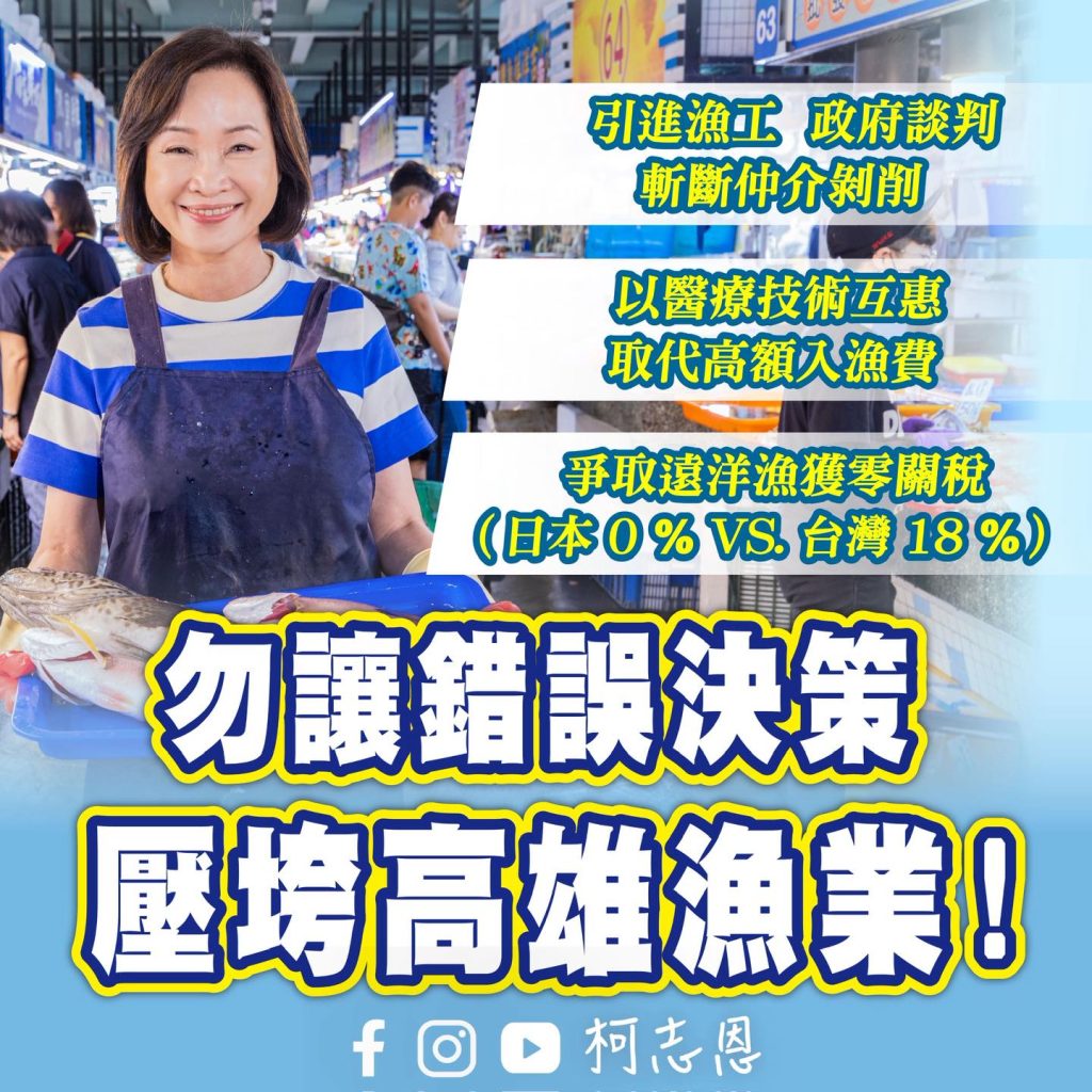 市長參選人柯志恩呼籲,不要讓高雄的漁船,在海上孤軍奮戰。拜託政府如果不做漁民的後盾,更不要讓錯誤的政策,成為壓垮高雄遠洋漁業的最後一根稻草。(取自柯志恩臉書)