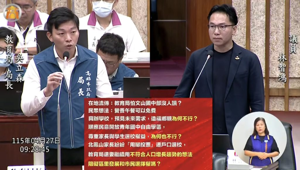 林智鴻強調,北鳳山已有鄉親五百多人連署,家長甚至為了讓孩子讀青年國中,得要遷戶籍選校「上有政策,下有對策,里民設籍跑光光,里政發展無法對應現況的窘境。」他也聽到地方盛傳「教育局是怕文山沒人讀,才不敢開放」,若真如此,教育局欠缺合理評估,又不回應民意的心態,將造就官民對立的惡意螺旋不斷升高。