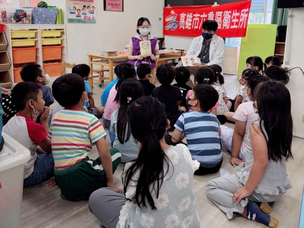 六龜衛生所醫護團隊向龍興國小附幼學童行前衛教兒童發展篩檢項目。 (記者王正平翻攝)