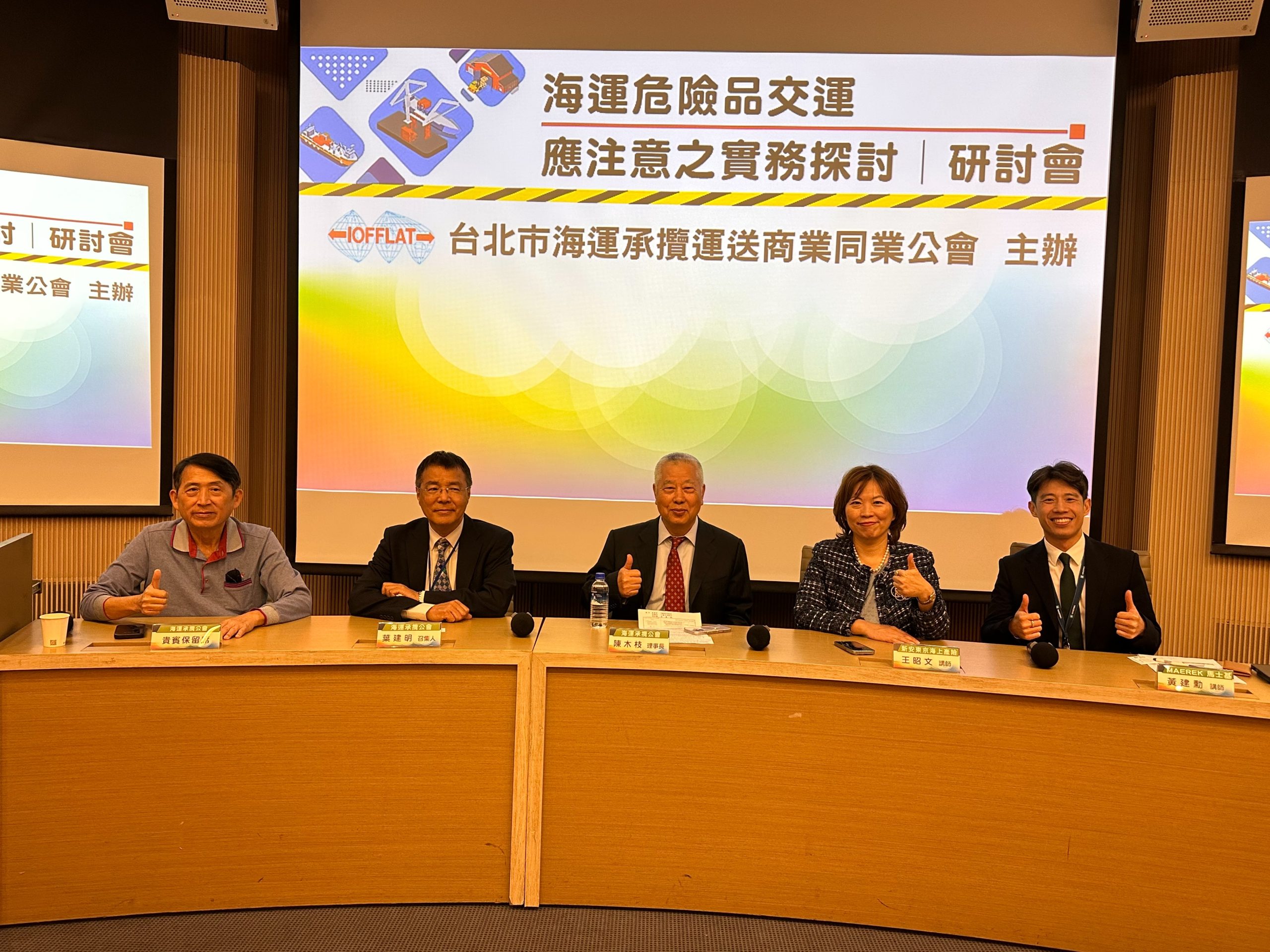 台北市海運承攬運送公會4月29日舉行海運危險品交運應注意之實務探討研討會,由理事長陳木枝及法規組召集人葉建明主持,會中邀請到馬士基/台灣快桅客服經理黃建勳針對危險品交運實務與經驗分享,及新安東京海上產險再保暨 國際事務群王昭文副總經理主講,裝載危險品所致災損之保險處置。此一議題業界非常關注,吸引約一百五十位業者與會。
